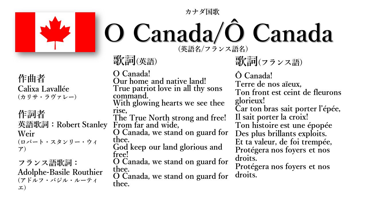これは、詳細で元の投稿訪問用の ট ইট র 世界の国歌bot カナダ国歌 おおカナダ 英語歌詞とフランス語歌詞がある 原文はフランス語で 1880年の愛国的な詩がフランス語 歌詞になった 英語歌詞はフランス語歌詞を基に様々なバージョンが生まれていたが ウィアの歌詞が最も有名で今日の歌詞と のスニペット画像です。 ここに